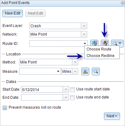 You can also click the Route ID drop-down arrow and click Choose Redline, then type the route ID for which the new event measures will be provided.